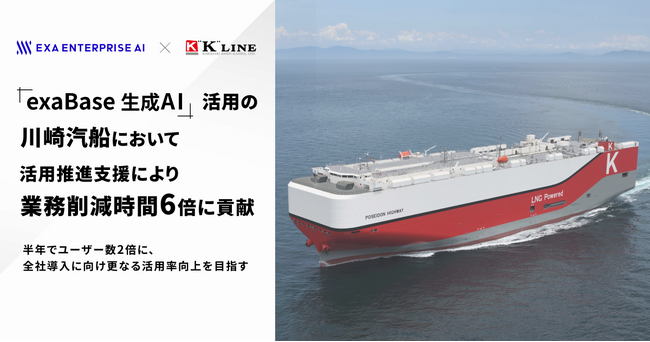 株式会社エクサウィザーズのグループ会社である株式会社Exa Enterprise AI(東京都港区、代表取締役:大植 択真、以下Exa Enterprise AI)は、当社の法人向けChatGPTサービス「exaBase 生成AI」を導入した川崎汽船株式会社(東京都千代田区、代表取締役社長 社長執行役員:明珍 幸一、以下川崎汽船)において、生成AI活用推進プログラムの提供などの支援を行いました。その結果、ユーザー数は半年で約2倍となり、全社員の半数以上まで増加しました。また、業務削減時間は1か月あたり420時間から2770時間へと6倍に増加し、約15人分の業務負担を効率化することに貢献しました。今後も川崎汽船における生成AIの活用促進と全社導入に向けた支援を行ってまいります。