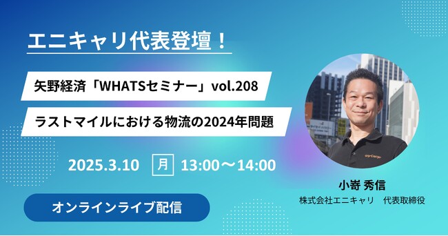 ラストマイル物流に特化した物流ソリューション事業を展開する株式会社エニキャリ(以下当社)の代表取締役 小嵜 秀信は、2025年3月10日(月)にオンラインライブ配信で開催される「WHATSセミナー vol.208」に登壇します。