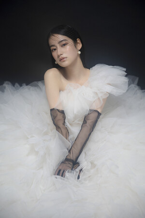 ブラックペーパーの背景にホワイトの衣装を合わせ、非日常的なモノトーンの世界観に。