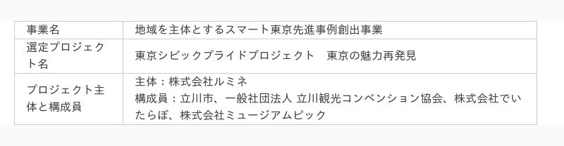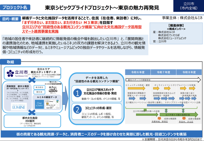 株式会社ミュージアムピック(所在地:宮崎県宮崎市、代表取締役:平林聡一朗)は、株式会社ルミネが主体となり立川市と共に推進している、立川エリアの回遊性のある観光コンテンツ構築を目指すプロジェクトに参画いたします。このプロジェクトは、立川市の魅力を最大化し、地域に根ざした文化・観光の活性化を図るためにデータを掛け合わせた新たな取組を実施します。