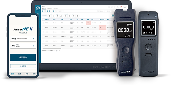 「アルキラーNEX」は、スマートフォンとアルコール検知器を連動させ、「いつ・どこで・誰が」アルコールチェックしたかを点呼記録と合わせてクラウドでデータ一元管理できるサービスです。