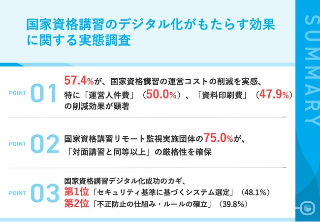 - 01|57.4%が、国家資格講習の運営コストの削減を実感、特に「運営人件費」(50.0%)、「資料印刷費」(47.9%)の削減効果が顕著