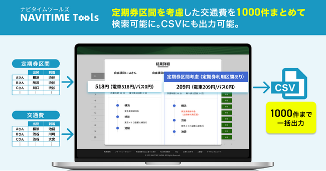 株式会社ナビタイムジャパン(代表取締役社長:大西啓介、本社:東京都港区)は、2025年2月14日(金)より、サイト上でCSVファイルをアップロードするだけで使える業務支援Webサービス『NAVITIME Tools』の「交通費まとめて検索」にて、定期券区間を考慮した交通費計算に対応します。合わせて、CSVファイルの出力だけでなく、サイト上で交通費の算出結果を確認できる機能も追加します。定期券区間を考慮しない場合の交通費との比較も可能となります。