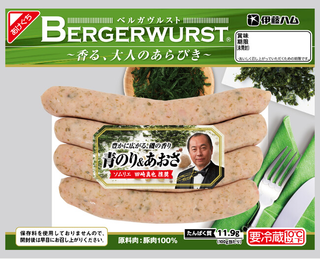 伊藤ハム株式会社は、ソムリエの田崎真也氏推奨のこだわりのソーセージ「BERGERWURST(R)(ベルガヴルスト)」シリーズより、「青のり&あおさ」を発売します。