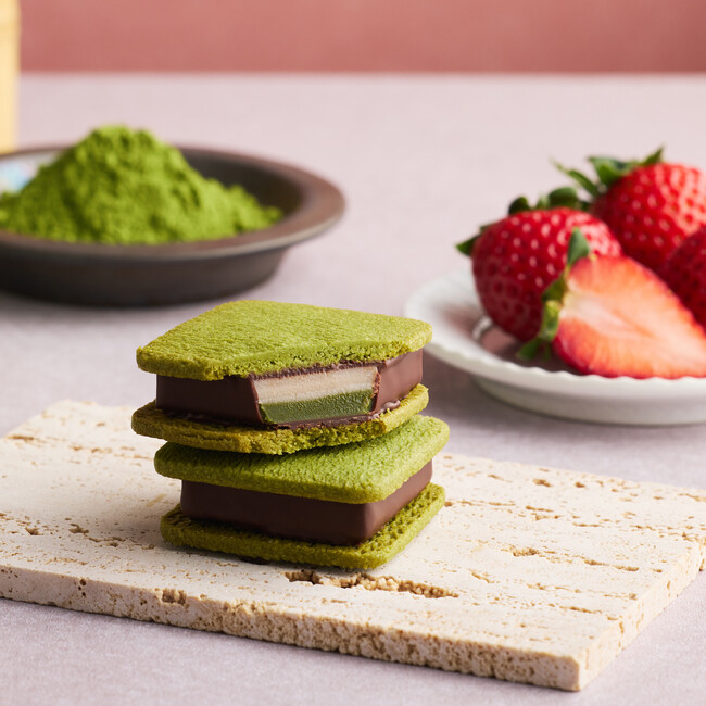 横浜市内の工房で作る自社オリジナルのホワイトチョコレート&ビターチョコレートを使用しています。ホワイトチョコレートは厳選したカカオバターを使い、優しい甘みで抹茶やいちごの香りを引き出す味わいに仕上げました。ビターチョコレートはガーナ産とエクアドル産カカオをブレンドしたこだわりのビターチョコレートです。抹茶のほろ苦さとチョコレートのマリアージュが楽しめるようなバランスを試行錯誤しました。クッキーは、今回のコラボレーションで初めて宇治抹茶をふんだんに使用する試みを実施。1枚1枚丁寧に焼き上げ、焼き色も細かく見極め選定したこだわりのクッキーです。