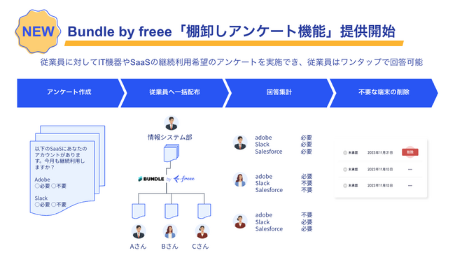 フリー株式会社(本社:東京都品川区、CEO:佐々木大輔、以下「freee」)が提供するオールインワンSaaS一元管理ツールのBundle by freeeは、PC端末やSaaSなどのIT資産の「棚卸しアンケート機能」の提供を開始しました。