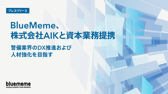 株式会社BlueMeme(本社:東京都千代田区、代表取締役:松岡 真功、以下 当社)は、AI技術を活用した警備システムを提供し警備業界のデジタルトランスフォーメーション(DX)を推進する株式会社AIK(本社:東京都渋谷区、代表取締役:宮宗 唯、以下 AIK社)との資本業務提携を締結しました。