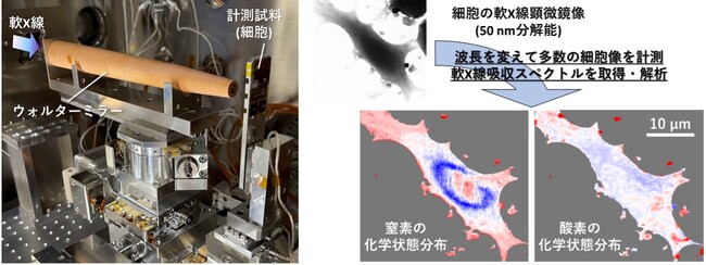 新たに開発した軟X線分光顕微鏡(左)と細胞の窒素・酸素の化学状態イメージング結果(右)。