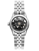スケルトン仕様の文字盤からは、ゼンマイが収められた11~12時位置の香箱、2~4番車、ガンギ車、アンクル、6時位置のヒゲゼンマイ付きテンプに至る、機械式時計を駆動させる輪列の精巧な造りと動きが、目を楽しませます。また、外縁ぎりぎりまでサファイアクリスタルで覆われたシースルー仕様のケースバックからは、W(ウェイル)字型のローターや巻き上げ輪列を鑑賞することができます。