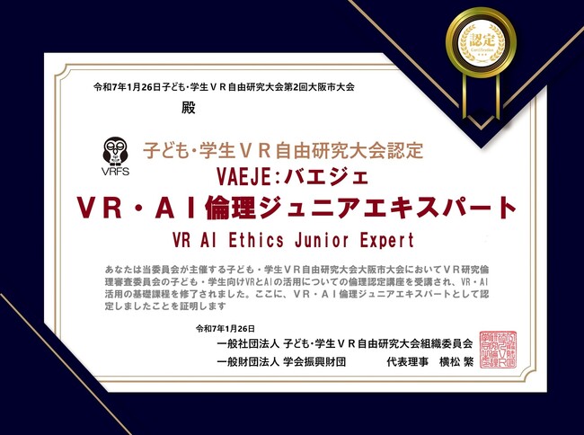 本大会では、多くの子どもたちが「VR・AI倫理ジュニアエキスパート認定試験」に挑戦し、見事合格を果たしました。この試験は、急速に発展するVR・AI技術に伴う倫理的課題、シンギュラリティ(技術的特異点)に向けた対策の重要性を学ぶことを目的としています。これからの社会で技術を安全かつ倫理的に活用できる人材を育成するための一歩として、大きな意義を持つ試験です。