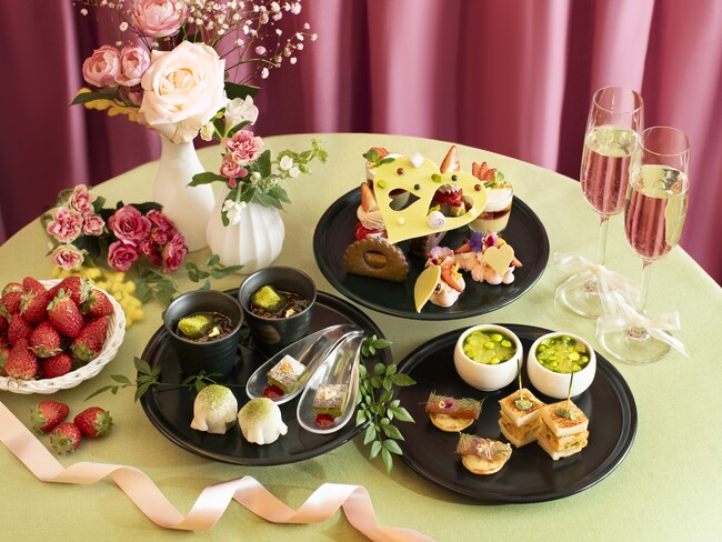 トップティアには華やかなエディブルフラワーを散りばめたストロベリーとショコラのスイーツが並び、うららかな春の到来を目と舌でお楽しみいただけます。さらに、ホワイトデー期間(※)限定バージョンとして、スプリンググリーンのハートをかたどった特別なプレートを提供します。スペシャルな装いで、大切な方への感謝や想いを伝えるシーンを演出します。