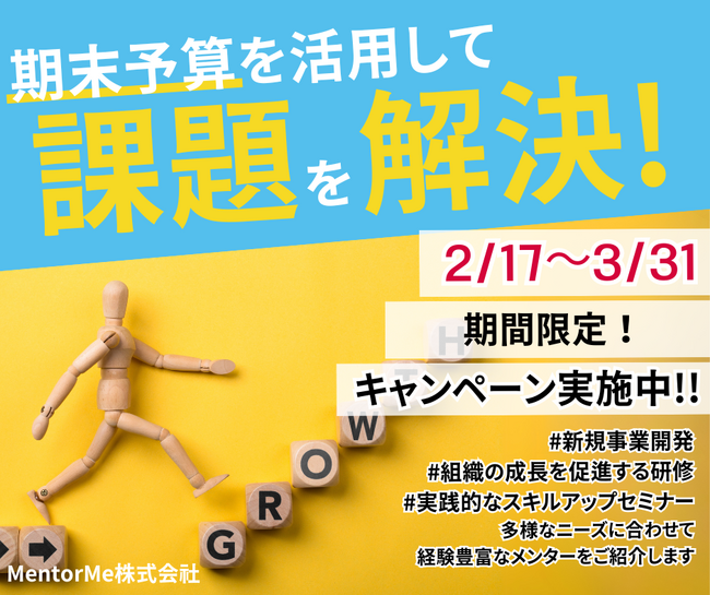 企業の新規事業開発や社内研修を支援する専門家マッチングプラットフォーム「MentorMe」(運営会社:MentorMe株式会社)は、通常価格よりも安価にメンターを紹介する「年度末キャンペーン」を実施いたします。