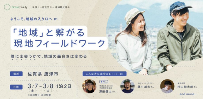 「地域と都市部」「地域と地域」を繋ぎ、関係人口・交流人口の創出に寄与する地域体験プログラム「mini Blue Project.」を展開する株式会社Grass Family.(本社:神奈川県海老名市、代表:荻野 孝史、以下「Grass Family.」)は、2025年3月7日(金)~ 3月8日(土)に佐賀県唐津市でフィールドワークを開催いたします。一般的な観光ツアーとは異なり、「誰に出会うかで地域の面白さは変わる」をコンセプトに、地域プレイヤーとの出会い・交流を通じて小川町の魅力を体感できるフィールドワークです。Grass Family.は今後も、「地域と都市」「地域と地域」を繋ぐことで新たな価値や体験をお届けします。