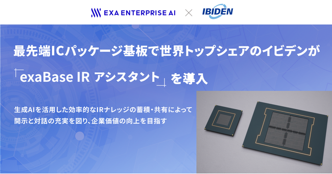 株式会社エクサウィザーズのグループ会社である株式会社Exa Enterprise AI(東京都港区、代表取締役:大植 択真、以下Exa Enterprise AI)は、イビデン株式会社(以下イビデン)が当社の「exaBase IRアシスタント」の導入を開始したことをお知らせします。イビデンは、業務特化型の生成AIを経営企画部 広報・ESGグループなど、株主・投資家向けの情報開示やIR説明会・個別面談に関係する部門で活用し、担当者の業務DXを推進し、付加価値の高い情報開示と対話に注力できる体制の実現を図ります。