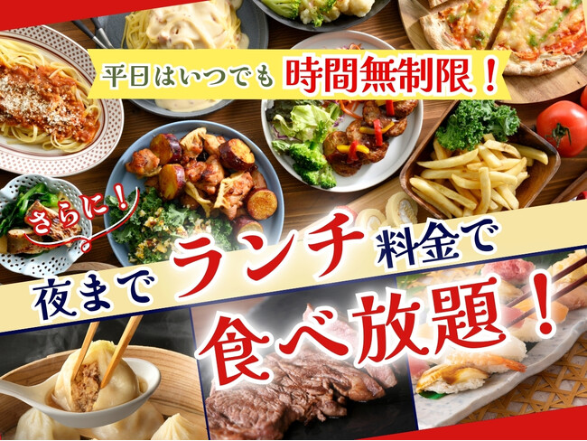 よりお得にお楽しみいただきたく、2025年2月28日(金)までの平日期間限定にて、終日『ランチ料金』にて充実した食べ放題をご提供!