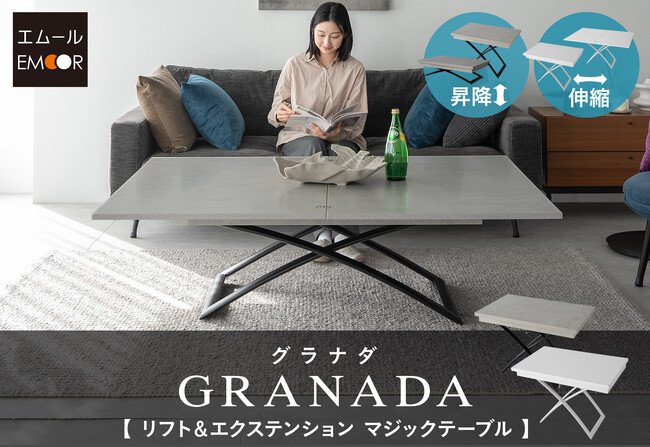 「身体に合った寝る・座る」を提供する健康家具ブランドEMOORを展開する株式会社エムール(東京都立川市:代表取締役 高橋 幸司)は、2025年2月14日より「リフト&エクステンション マジックテーブル GRANADA~グラナダ~(以下GRANADA)」の販売を開始しました。GRANADAは、伸縮機能と昇降機能を兼ね備えた多機能テーブルです。普段はコンパクトに、必要な時にすぐ広げられるため、ダイニングテーブル、リビングテーブル、ワークデスク、作業台など多用途に活躍します。
