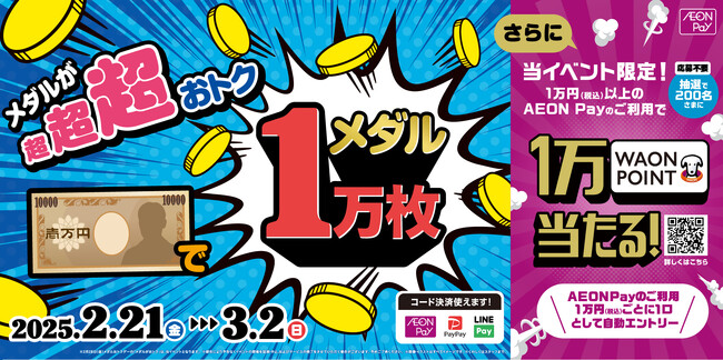 さらにAEON Payでお支払いいただくと、抽選で200名さまに1万WAON POINTが当たるキャンペーンを同時開催します。