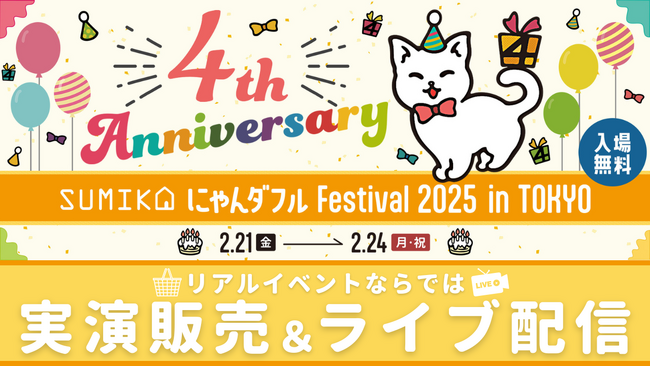 株式会社TIRAMISU(本社:東京都世田谷区 代表取締役:高澤 匡 以下「当社」)が運営する 猫ぐらしブランド「キミとワタシのSUMIKA」は2025年2月21日から2月24日の4日間に渡り「東京都中小企業会館」1Fイベントスペース(東京都中央区銀座2-10-18)にて、ブランド生誕4周年記念イベント、SUMIKA 4th Anniversary『にゃんダフルFestival 2025 in TOKYO』を開催いたします。