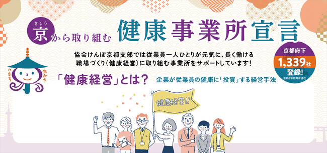 協会けんぽ京都支部では、加入事業所様のより一層の健康づくり推進のため、健康経営に取り組むことを宣言した事業所を認定し、サポートする「京(きょう)から取り組む健康事業所宣言」を実施しています。