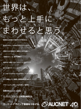 今回の記念広告では、40周年を象徴するメインコピー「世界は、もっと上手にまわせると思う。」を掲げました。このコピーには、オークネットがこれまで築きあげてきたノウハウやアイデアをもとに、国境や事業領域を越え、さまざまなパートナーとともに循環型社会の実現に向けて挑戦していくという、未来へ向けた新たな決意を込めています。
