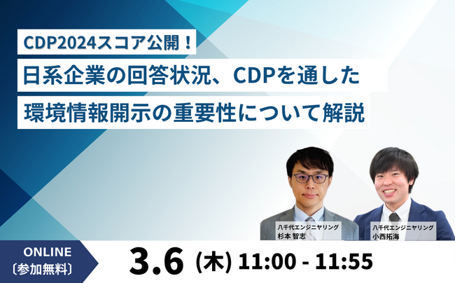 八千代エンジニヤリング株式会社(本店:東京都台東区、代表取締役社長執行役員:高橋 努)は、無料オンラインセミナー「CDP2024スコア公開! 日系企業の回答状況、CDPを通した環境情報開示の重要性について解説」を3月6日(木)に開催します。