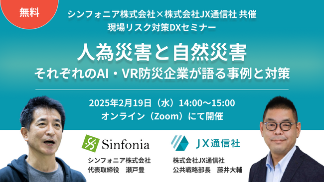 防災DXを推進する報道ベンチャーの株式会社JX通信社(東京都千代田区、代表取締役 米重 克洋、以下「JX通信社」)と、シンフォニア株式会社(東京都府中市、代表取締役社長 瀬戸 豊、以下「シンフォニア」)は、2月19日(水)共催ウェビナーを開催することをお知らせします。
