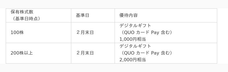 このたび、利用者ごとに選択可能な品目での優待のご希望を株主の皆様より複数頂いたこともあり、株主の皆様の利便性向上を目的としてQUOカードpayやAmazonギフトカードなど、ご希望に応じて選択できるデジタルギフトに優待品目を変更することといたしました。
