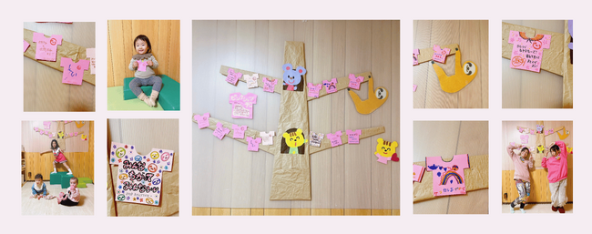 ・ ピンクシャツにメッセージを書いて壁面に飾る