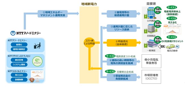 この障壁を乗り越えるため、NTTアノードエナジー、NTTスマイルエナジー、NTTアドバンステクノロジの三社は、各社のノウハウやソリューションを組み合わせ、地域内に点在するエネルギー資源を統合的に管理し、それらを効率的に運用することで、市場価格の高い時間帯に調達する電力量の低減や、ピークシフトによる容量拠出金の負担低減など、各施設の太陽光発電の電力を余すことなく地産地消させるだけでなく、地域全体での経済性向上も同時に実現する「地域エネルギーマネジメントサービス」の提供に向けた実証試験を共同で開始しました。