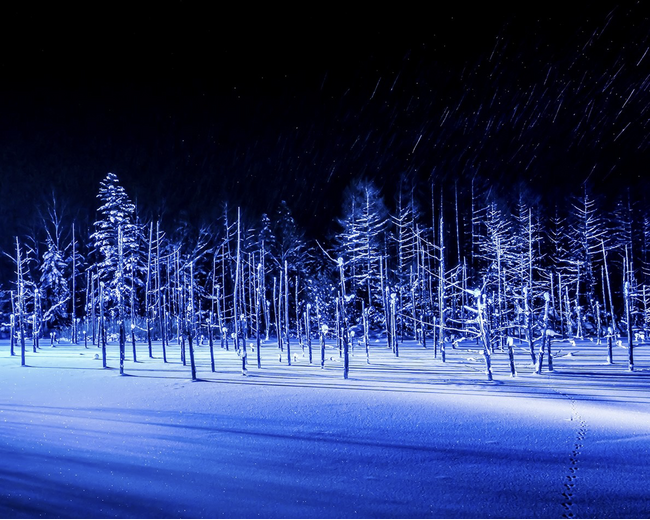 ライトアップされた青い池は、昼間とは異なる幻想的な雰囲気を演出。雪景色と青い光が織りなす美しいコントラストは、訪れる人々を夢の世界へと誘います。特に澄んだ夜空とのコラボレーションは、息をのむような絶景です。