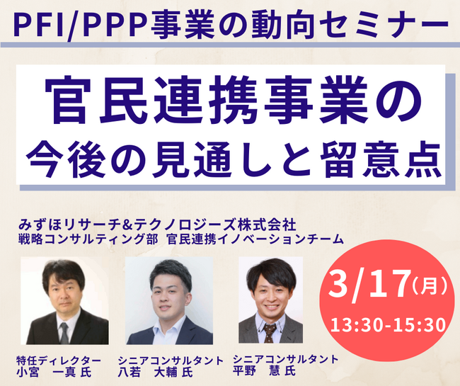 JPI(日本計画研究所)は、みずほリサーチ&テクノロジーズ株式会社 戦略コンサルティング部 官民連携イノベーションチーム 特任ディレクター 小宮 一真 氏、シニアコンサルタント 八若 大輔 氏、シニアコンサルタント 平野 慧 氏を招聘し、PFI事業を含む官民連携事業の今後の見通しと留意点について詳説いただくセミナーを開催します。
