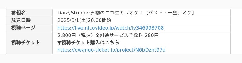 【3/1(土)20:00~】夕霧(DaizyStripper)、一聖(BugLug)、ミケ(我が為)によるカラオケ番組がニコ生で配信決定!
