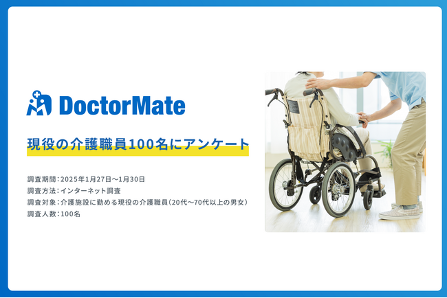 介護事業所向けに医療ソリューションを提供するドクターメイト株式会社(本社:東京都中央区、代表取締役・医師 青柳 直樹、以下ドクターメイト)は、現役の介護職員を対象にした調査を実施しました。この調査結果から、介護職員の業界に対する内情、実態が明らかになりました。