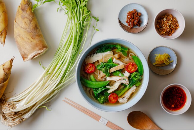 芹、筍、絹さやといった春の野菜と、京都の「南禅寺豆腐屋 服部」の油揚げを使ったおうどんは、旨味がじっくりと広がるかつおのお出汁に春野菜が馴染み、ほっとした味わいをお楽しみいただけます。付け合わせには、シェフこだわりの4種類のコンディメントを。中でもおすすめはフライドオニオン・白葱・生姜、黒七味をライスパフと合わせたザクザクの食感が楽しい「スパイスチップ」、さらに八角と醤油で生姜を煮込んだオリエンタルな味わいの「生姜の甘辛煮」、唐辛子、ガーリック、玉ねぎをごま油でじっくりと火入れをした旨味たっぷりの「食べるラー油」、爽やかさを添える「刻み柚子(皮)」と、さまざまな味わいの変化を楽しめるのもうれしいポイントです。