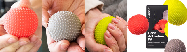 「ナボソ ハンドアクティベーションキット」は、手と指の感覚を刺激、筋肉のリリースや強化に最適なアイテム。米国特許取得済み(米国特許第11642279号)のナボソ独自のテクスチャーで覆われた、人間工学に基づいてデザインされた3種類のボールがひとつのキットになっています。