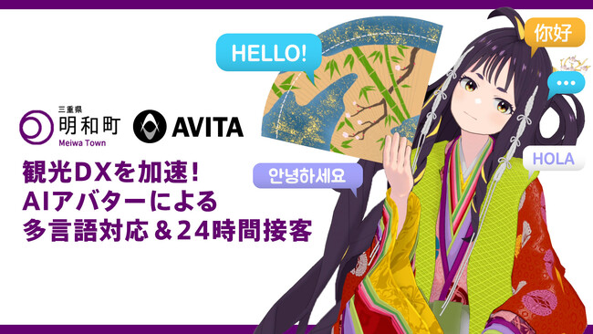 AVITAは、2023年2月より三重県明和町の「持続可能なまちづくり」を目指す地方創生プロジェクトを推進してきました。この度、明和町の観光案内所内に、2024年に制作した明和町オフィシャルアバター「日月 和姫(ひづき なごみ)」が案内人となったAIアバターが導入されます。