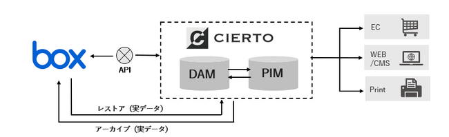 Boxは全社的な情報管理を高いコストパフォーマンスで実現出来るクラウドストレージサービスです。一方、CIERTOは、Webサイト、ECサイト、SNS、カタログなどあらゆる媒体のコンテンツ制作プロセスを支援するDAMシステムです。制作進行中のデータはもちろん、完成したデータにおいてもCIERTO内で一元管理することが可能です。しかし、多くの媒体・コンテンツは保存期間に比例して、データの利用頻度が低下する場合があります。この様なケースでは、CIERTOからBoxへ大容量データを適切にアーカイブすることが可能となります。そしてBoxにアーカイブしたデータは、必要に応じていつでも簡単な操作でCIERTO内に戻し活用することが可能となりました。