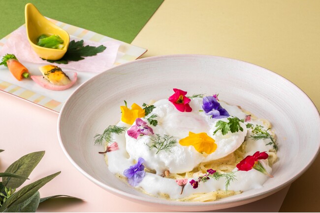 【花咲くカルボナーラ風うどん】エディブルフラワーなどを散りばめて、春のお花畑を連想させるよう可愛らしく仕上げました。