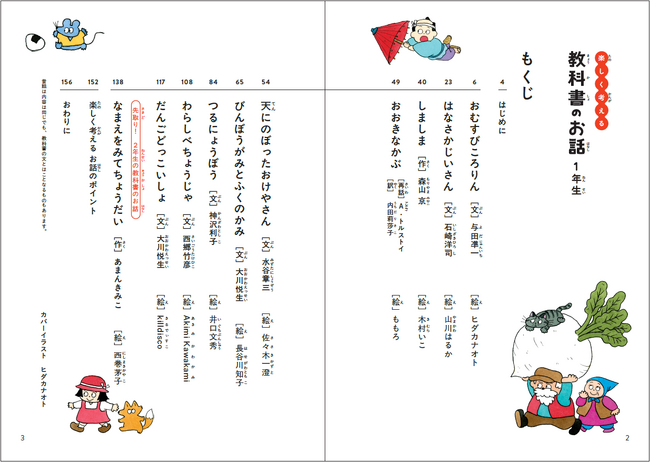 1年生には「おむすびころりん」「おおきなかぶ」といった定番のお話から、是非読んでほしい昔話や民話を含めた全10話を収録。その他の学年も、年齢に合わせたお話がそれぞれ10話入っています。
