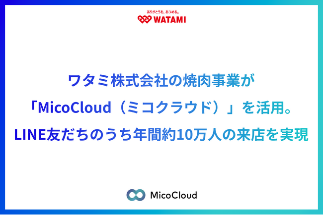 Micoworks株式会社(本社:大阪市北区、代表取締役社長:山田 修)は、国内外食大手のワタミ株式会社(本社:東京都大田区、代表取締役会長兼社長 CEO:渡邉 美樹)の「焼肉の和民」、「かみむら牧場」でLINEを活用したマーケティングプラットフォーム「MicoCloud(ミコクラウド)」を活用し、LINE公式アカウント友だちのうち、年間約10万人が来店しており、集客基盤の構築に成功したことを発表いたします。