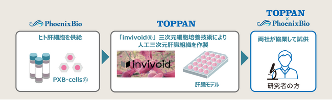 TOPPANホールディングスは、これまでに3D細胞培養技術「invivoid(R)」を大阪大学大学院工学研究科 松崎典弥教授と共同で開発しており、がん個別化医療、創薬研究、培養肉などに向けた研究を進めています。本業務提携により、TOPPANホールディングスの「invivoid(R)」とフェニックスバイオの新鮮ヒト肝細胞「PXB-cells(R)」を組み合わせた「人工三次元肝臓組織」(以下 肝臓モデル)について共同での試供を開始します。