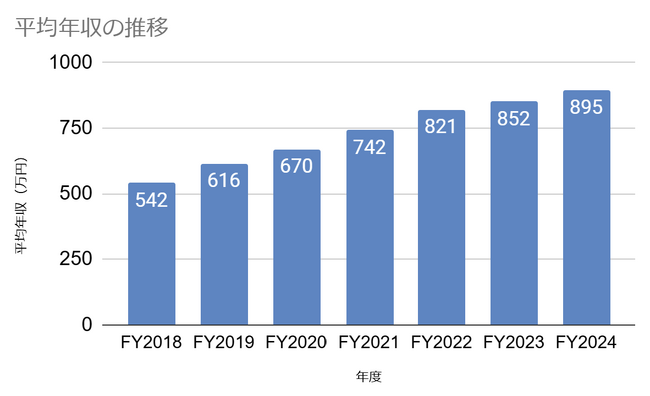 2018年から2024年にかけて、平均年収は10%程度の昇給を2018年から6年連続で実施してきており、2024年度は平均年収が895万円(平均年齢 33.4歳)となり、この間トータル65%の年収アップを実現してきました。