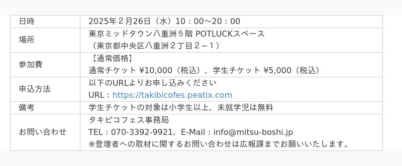 【「TAKIBI&Co. Fes Tokyo」の開催概要】