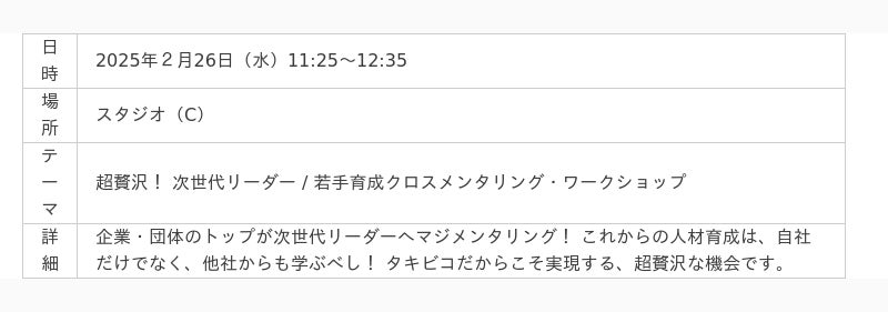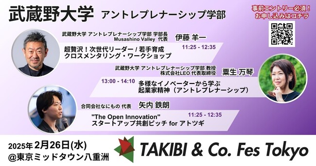 武蔵野大学アントレプレナーシップ学部(東京都西東京市、学部長:伊藤 羊一)は、2025年2月26日(水)に東京ミッドタウン八重洲で開催されるアトツギとスタートアップの共創イベント「TAKIBI&Co. Fes Tokyo(タキビコフェストーキョー)」に、参加・協力します。「TAKIBI&Co. Fes Tokyo」は、アトツギ×スタートアップの“クロッシング”機会を創出し、このコンセプトを広く全国へ発信することを目的に各分野のキープレイヤーが集結し、老舗企業とスタートアップ企業の未来などについて議論するクロストークや、ピッチイベントなど、14セッションを展開する予定です。また、『タキビコ※』名物の登壇者と参加者が混じり合う交流会も予定しており、業界や地域を超えて集う人々との“クロッシング”の機会を促進します。
