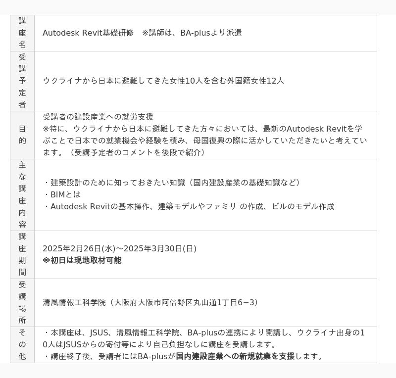 BuildApp(ビルドアップ)で建設DXに取り組む野原グループのBA-plus(ビーエープラス)株式会社(本社:東京都新宿区、代表取締役社長:塩谷 元宏)は、ウクライナ学生支援会(JSUS:Japanese Supports for Ukrainian Students、代表:清風情報工科学院 校長 平岡 憲人)とともに学校法人 清風明育社(本社:大阪府大阪市阿倍野区、理事長:平岡 龍人)が運営する専門学校「清風情報工科学院」 にて、ウクライナから日本に避難してきた女性10人(母国の国立大理系卒)を含む外国籍12人を対象に2025年2月26日(水)に「BIM講座」を開講し、講座終了後には国内建設産業への新規就業を支援することをお知らせいたします。今後も、同校にて同様の講座を開講予定です。