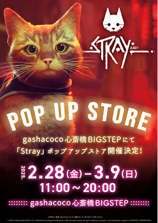 株式会社ハピネット(本社:東京都台東区、代表取締役社長:榎本誠一、証券コード:7552、以下ハピネット)は、おもしろいインディーゲームを世界中からセレクトして発売するゲームレーベル「Happinet Indie Collection」タイトルの『Stray』について、gashacoco 心斎橋BIGSTEPにてPOP-UPストアを開催することをお知らせいたします。