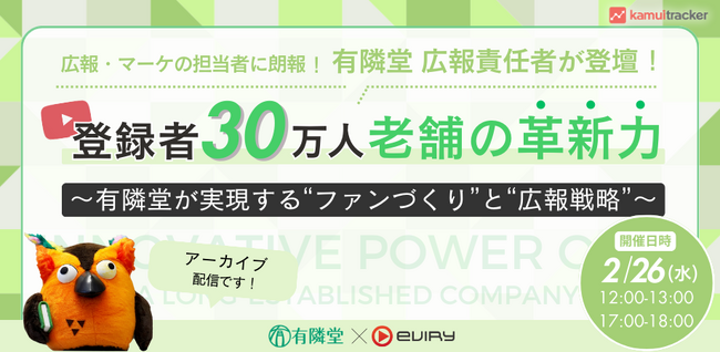 株式会社エビリー(本社:東京都渋谷区、代表取締役社長:中川恵介 以下、エビリー)は、2025年2月12日に株式会社有隣堂(本社:横浜市中区、代表取締役 社長執行役員:松信 健太郎 以下、有隣堂)を招き、「登録者30万人 老舗の革新力 ~有隣堂が実現する”ファンづくり”と”広報戦略”」と題したセミナーを開催致しました。本セミナーでは、多くのYouTube担当者の皆様にご参加いただき、企業チャンネルとして30万人の登録者を誇る「有隣堂」の事例をもとに、YouTube運営の戦略やノウハウを直接学ぶ機会を提供しました。この度、好評につきアーカイブの配信が決定致しましたのでお知らせします。