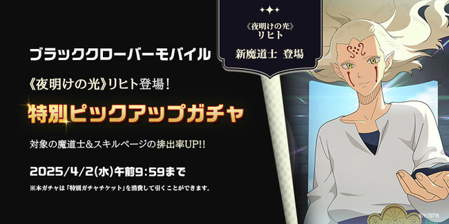 株式会社VIC GAME STUDIOS JAPAN(東京都新宿区、代表取締役:李 同校)は、テレビアニメ『ブラッククローバー』のアプリゲーム『ブラッククローバーモバイル 魔法帝への道 The Opening of Fate』(以下、ブラクロモ)において、本日2月19日(水)よりSSR魔道士「《夜明けの光》リヒト」と魔道士スキルページ「青緑の雷神」が新登場したことをお知らせいたします。
