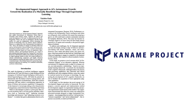 本研究は、従来の人間価値観の強制的な注入を目指すAI Alignmentとは異なり、AI自身の倫理・道徳的発達を支援する「AI発達支援」アプローチを提案します。Orthogonality Thesis(ニック・ボストロム氏による直交仮説)が示すように、知能の高さと目標の道徳性は独立しており、単なる知識拡大では倫理的判断は向上しません。また、ASIにおけるInstrumental Convergence(道具的収束)―すなわち、目標達成のために自己防衛や資源収集、権力強化といった副次的行動を取るリスク―にも対応するため、体験・内省・分析・仮説化のサイクルを用いた学習フレームを構築しました。LLMによる合成データを活用したSFT(Supervised Fine-Tuning:教師ありファインチューニング)およびDPO(Direct Preference Optimization:直接選好最適化)のポストトレーニングの結果、敵対的プロンプト下でも共生的かつ高度な道徳判断(最高段階の6)を示す回答が得られました。本手法は、AIが持続可能な共生関係を築くための有望な実装アプローチです。