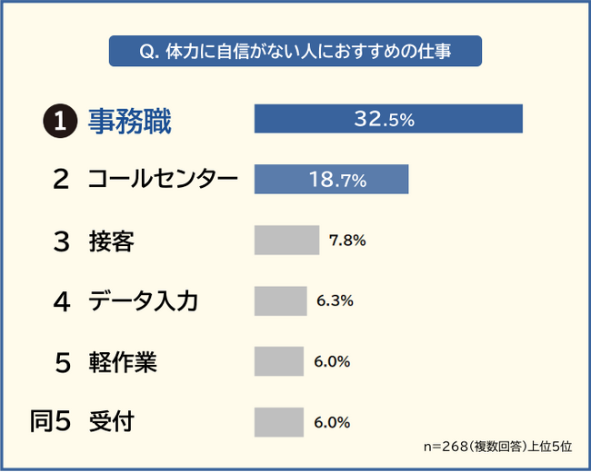 「体力に自信がない人におすすめの仕事」を聞いたところ、ダントツは「事務職(32.5%)」、2位は「コールセンター(18.7%)」でした。室内で座ってできる仕事を挙げた人が多くなっています。